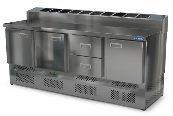 Стол для пиццы Камик СОП-402076Н используется на предприятиях общественного питания и торговли для хранения пиццы, салатов, сэндвичей и других блюд и ингредиентов к ним в охлажденном состоянии.
