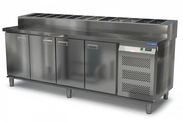Стол для пиццы Камик СОП-402373 используется на предприятиях общественного питания и торговли для хранения пиццы, салатов, сэндвичей и других блюд и ингредиентов к ним в охлажденном состоянии.