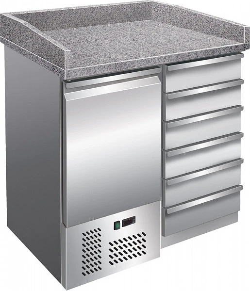 Стол для пиццы Koreco SPZ4001 со столешницей из гранита глубиной 700 мм, одной дверью и 6 нейтральными выдвижными ящиками используется на предприятиях общественного питания и торговли для хранения пиццы, салатов, сэндвичей и других блюд и ингредиентов к ним в охлажденном состоянии.