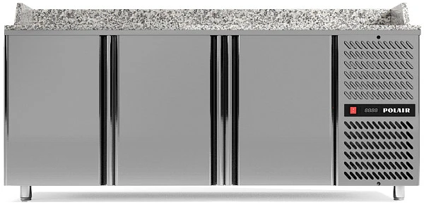 Рабочая поверхность выполнена из особым образом отшлифованного натурального гранита, очень твердого и сложного в обработке материала, являющегося оптимальным для использования в качестве стола для изготовления основы и для сборки пиццы. С трех сторон рабочая поверхность стола ограничена гранитными бортами высотой 150 мм. Такая конструкция позволяет удобно разместить на столах охлаждаемую витрину для ингредиентов (топингов), не занимая при этом пространства столешницы и не мешая работе пиццайоло.