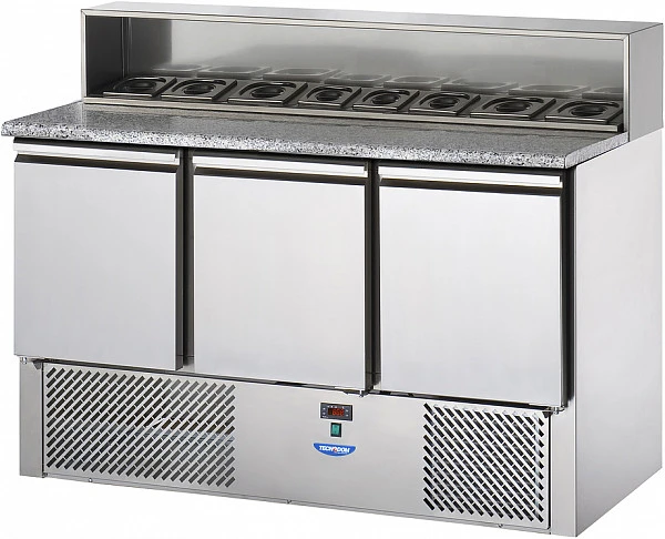 Стол для салатов Tecnodom SLV03AI используется для обработки ингредиентов, используемых для приготовления пиццы, салатов и других блюд, а также для охлаждения и кратковременного хранения скоропортящихся продуктов и напитков.