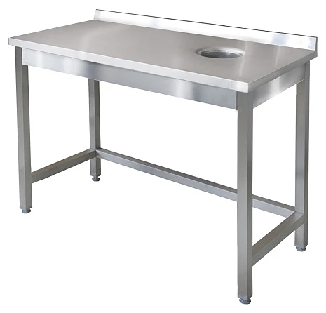 Модель оснащена ножками, регулирующимися по высоте. Разборный каркас выполнен из квадратного уголка 40х40 мм из нержавеющей стали, столешница - из нержавеющей стали с двойной ламинированной ДСП. Отверстие для сбора отходов по центру, слева или справа (зависит от модификации).