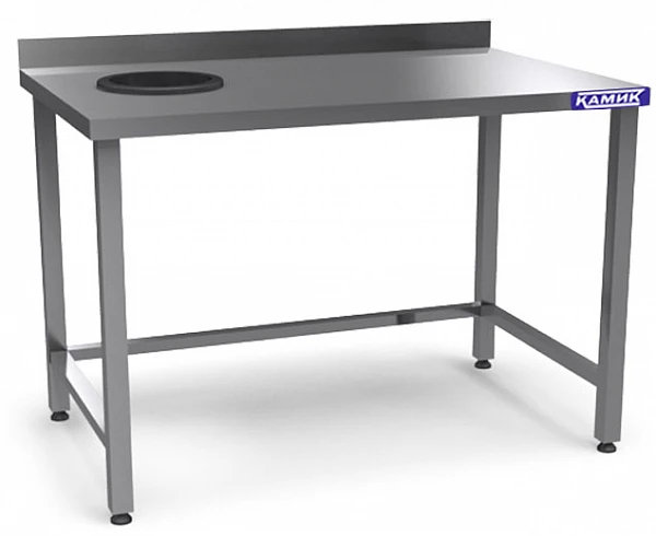 Стол с отверстием для сбора отходов D=200 мм, резиновым кольцом для фиксации пакетов и ножками на регулируемых опорах изготовлен полностью из нержавеющей стали.
