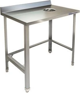 Стол для сбора отходов состоит из столешницы из пищевой нержавеющей стали с отверстием диаметром 180 мм в центре столешницы с направляющей горловиной, смещенной влево или вправо по желанию заказчика.