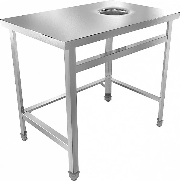 Стол для сбора отходов состоит из столешницы из пищевой нержавеющей стали с отверстием диаметром 180 мм в центре столешницы с направляющей горловиной, смещенной влево или вправо по желанию заказчика.