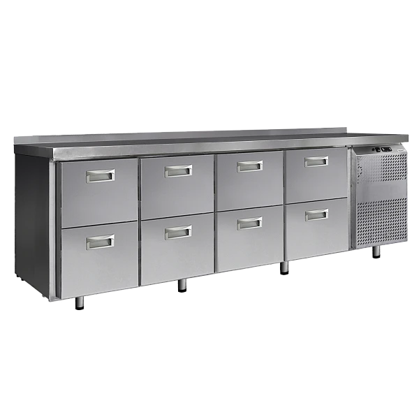 Холодильный стол выполнен из высококачественной пищевой нержавеющей стали. Столы могут производиться (выпускаться) с распашными дверями (ящиками), которые имеют надежные петли (для ящиков направляющие) с опцией доводчиков, что обеспечивает гарантированное закрытие и поддержание заданной температуры в рабочем объеме стола. Используется электрический блок управления с функцией автоматической оттайки. Передняя панель моторного отсека имеет большую площадь перфорации, что позволяет обеспечить холодильному агрегату поступление воздуха для охлаждения.
