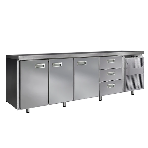 Холодильный стол выполнен из высококачественной пищевой нержавеющей стали. Столы могут производиться (выпускаться) с распашными дверями (ящиками), которые имеют надежные петли (для ящиков направляющие) с опцией доводчиков, что обеспечивает гарантированное закрытие и поддержание заданной температуры в рабочем объеме стола. Используется электрический блок управления с функцией автоматической оттайки. Передняя панель моторного отсека имеет большую площадь перфорации, что позволяет обеспечить холодильному агрегату поступление воздуха для охлаждения.