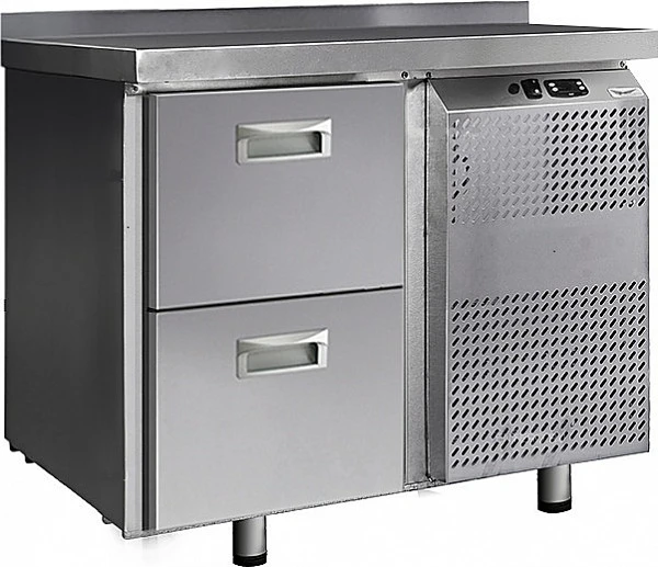 Стол холодильный Финист СХС-700-0/2 предназначен для хранения предварительно охлажденных мясных и рыбных полуфабрикатов, заготовок для салатов, молочной продукции, охлажденных напитков и других пищевых продуктов на предприятиях общественного питания и торговли. Модель оснащена расположенным сбоку агрегатным отсеком, столешницей с задним бортом, 2 выдвижными ящиками, устойчивыми ножками с подпятниками, кабелем питания с евровилкой и кнопочной панелью управления с цифровым дисплеем. Корпус выполнен из высококачественной нержавеющей стали.