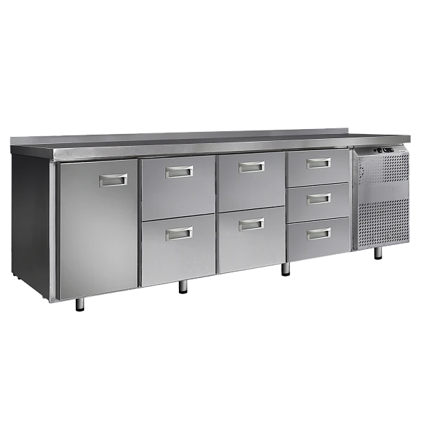Холодильный стол выполнен из высококачественной пищевой нержавеющей стали. Столы могут производиться (выпускаться) с распашными дверями (ящиками), которые имеют надежные петли (для ящиков направляющие) с опцией доводчиков, что обеспечивает гарантированное закрытие и поддержание заданной температуры в рабочем объеме стола. Используется электрический блок управления с функцией автоматической оттайки. Передняя панель моторного отсека имеет большую площадь перфорации, что позволяет обеспечить холодильному агрегату поступление воздуха для охлаждения.