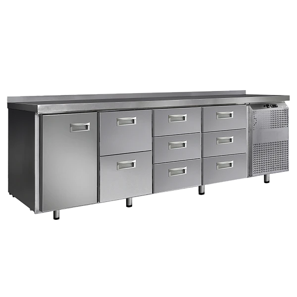 Холодильный стол выполнен из высококачественной пищевой нержавеющей стали. Столы могут производиться (выпускаться) с распашными дверями (ящиками), которые имеют надежные петли (для ящиков направляющие) с опцией доводчиков, что обеспечивает гарантированное закрытие и поддержание заданной температуры в рабочем объеме стола. Используется электрический блок управления с функцией автоматической оттайки. Передняя панель моторного отсека имеет большую площадь перфорации, что позволяет обеспечить холодильному агрегату поступление воздуха для охлаждения.