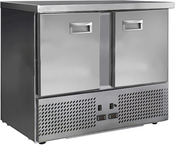 Стол холодильный среднетемпературный гастронормированный, GN2/3, без борта, с охлаждаемой столешницей, изготовлен из нержавеющей стали. Температурный режим: стола -2/+8С, столешницы +2/+7С. Стол имеет 2 глухие распашные двери, нижний агрегат, динамическую систему охлаждения, 4 регулируемые по высоте ножки, 2 микропроцессорных блока управления, автоматическую оттайку испарителя, цельнозаливной корпус. Столешница имеет независимую панель управления. Благодаря наличию двух пультов управления холодильный стол может работать на охлаждение поверхности и объёма одновременно или раздельно. Задняя стенка стола выполнена из оцинкованной стали.