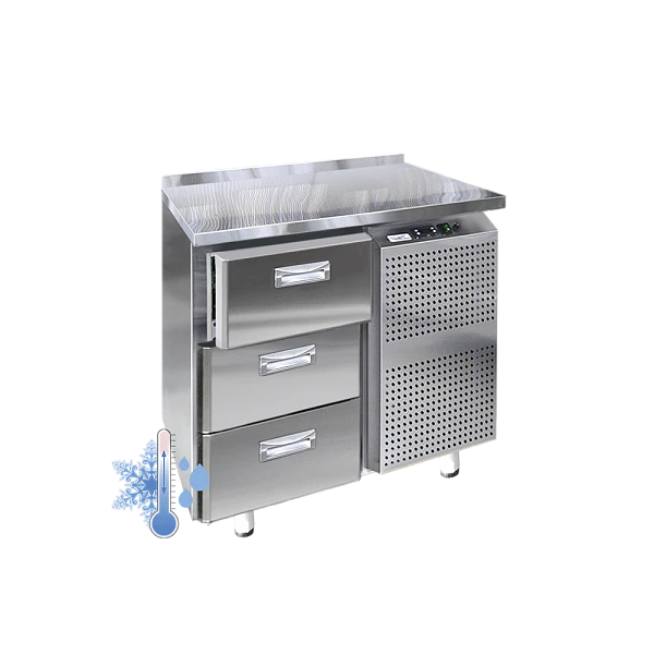 Холодильный стол выполнен из высококачественной пищевой нержавеющей стали. Используется электрический блок управления с функцией автоматической оттайки. Передняя панель моторного отсека имеет большую площадь перфорации, что позволяет обеспечить холодильному агрегату поступление воздуха для охлаждения.