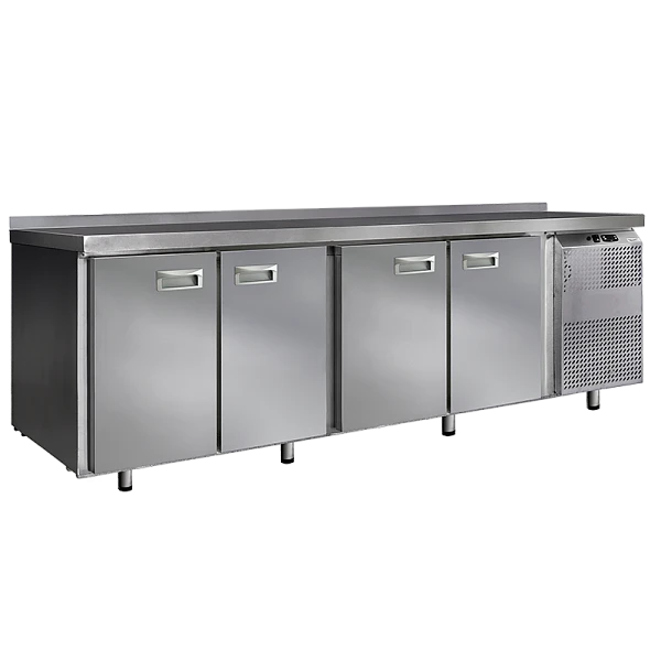 Стол выполнен из высококачественной пищевой нержавеющей стали. Столы могут производиться (выпускаться) с распашными дверями (ящиками), которые имеют надежные петли (для ящиков направляющие) с опцией доводчиков, что обеспечивает гарантированное закрытие и поддержание заданной температуры в рабочем объеме стола. Используется электрический блок управления с функцией автоматической оттайки. Передняя панель моторного отсека имеет большую площадь перфорации, что позволяет обеспечить холодильному агрегату поступление воздуха для охлаждения.