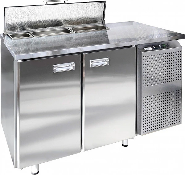 Стол холодильный саладетта Финист СХСс-600-2 предназначен для сохранения свежести ингредиентов для холодных закусок и салатов на предприятиях общественного питания и торговли. Модель оснащена расположенным сбоку агрегатным отсеком, столешницей с задним бортом и отсеком под гастроемкости с крышкой, 2 холодильными камерами с распашными дверцами, устойчивыми ножками с подпятниками, кабелем питания с евровилкой и кнопочной панелью управления с цифровым дисплеем. Цельнозаливной корпус выполнен из высококачественной нержавеющей стали.