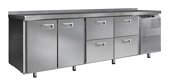 Столешница выполнена из нержавеющей стали и обладает повышенной прочностью. Двери оборудуются доводчиками, которые автоматически закрывают их, что предотвращает непредвиденное размораживание.