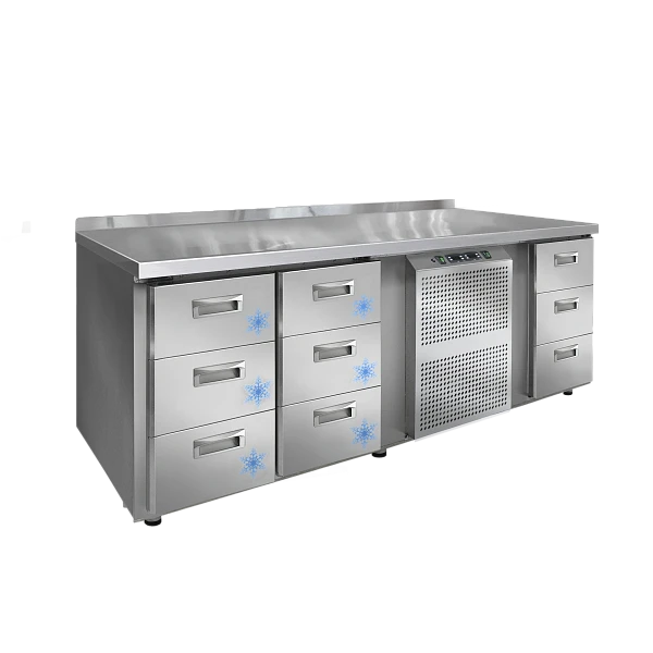Столешница выполнена из нержавеющей стали и обладает повышенной прочностью. Двери оборудуются доводчиками, которые автоматически закрывают их, что предотвращает непредвиденное размораживание.