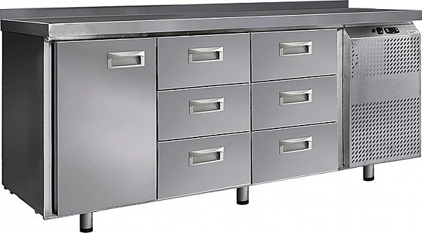 Стол морозильный Финист НХС-700-1/6 предназначен для хранения предварительно замороженных пищевых продуктов на предприятиях общественного питания и торговли. Модель оснащена расположенным сбоку агрегатным отсеком, столешницей с задним бортом, холодильной камерой с распашной дверцей, 6 выдвижными ящиками, устойчивыми ножками с подпятниками, кабелем питания с евровилкой и кнопочной панелью управления с цифровым дисплеем. Цельнозаливной корпус выполнен из высококачественной нержавеющей стали.