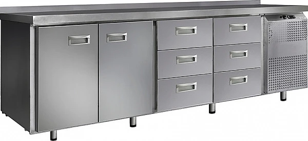 Стол морозильный Финист НХС-700-2/6 предназначен для хранения предварительно замороженных пищевых продуктов на предприятиях общественного питания и торговли. Модель оснащена расположенным сбоку агрегатным отсеком, столешницей с задним бортом, 2 холодильными камерами с распашными дверцами, 6 выдвижными ящиками, устойчивыми ножками с подпятниками, кабелем питания с евровилкой и кнопочной панелью управления с цифровым дисплеем. Цельнозаливной корпус выполнен из высококачественной нержавеющей стали.