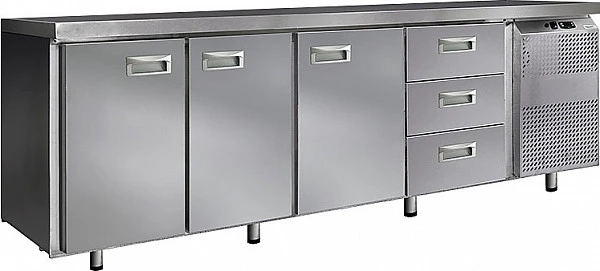 Стол морозильный Финист НХС-700-3/3 предназначен для хранения предварительно замороженных пищевых продуктов на предприятиях общественного питания и торговли. Модель оснащена расположенным сбоку агрегатным отсеком, столешницей, 3 холодильными камерами с распашными дверцами, 3 выдвижными ящиками, устойчивыми ножками с подпятниками, кабелем питания с евровилкой и кнопочной панелью управления с цифровым дисплеем. Цельнозаливной корпус выполнен из высококачественной нержавеющей стали.
