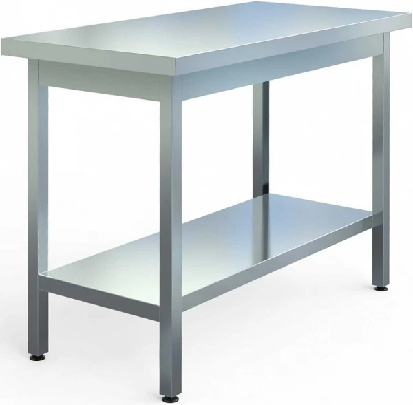 Без борта, оснащён рамкой столешницы (юбкой) из нержавеющей стали AISI 430 толщиной 1мм, сплошной нижней полкой из нержавеющей стали AISI 430 толщиной 0,7мм.