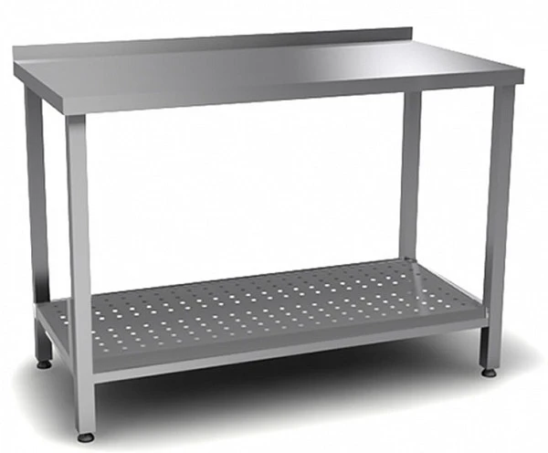 Стол производственный с перфорированной полкой для разделки и обработки пищевых продуктов изготовлен полностью из нержавеющей стали, ножки изготовлены из стального трубы 40х40мм.