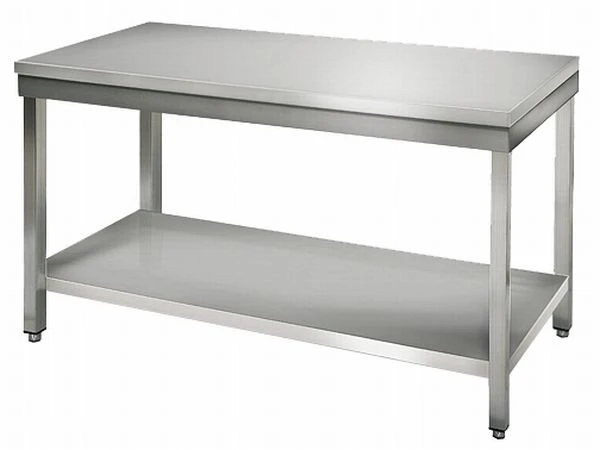 Стол рабочий класса HEAVY-DUTY островной, с полкой, размером 600*600*850 устойчивый к воздействию производственных статических и динамических нагрузок. Столешница рабочего стола из нержавеющей стали AISI304 толщиной 1 мм, конструкционный материал несущего каркаса и нижней полки- нержавеющая сталь AISI201. Столешница усилена вкладкой из ДСП с ламинированием открытой стороны. Рабочий стол поставляется в разобранном виде в плоской упаковке. Комплект поставки включает в себя: рабочую поверхность; ножки из трубы квадратного сечения 40*40 мм которые оканчиваются регулируемыми по высоте пятками из нескользящего пластика, не повреждающего покрытие пола, позволяющими устанавливать стол горизонтально на не ровном полу; сплошную нижнюю полку; набор крепежа и инструмент для сборки. Комплект легко собираемый.