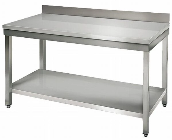 Стол рабочий класса HEAVY-DUTY пристенный, с полкой, размером 600*600*850 устойчивый к воздействию производственных статических и динамических нагрузок. Столешница рабочего стола из нержавеющей стали AISI304 толщиной 1 мм, конструкционный материал несущего каркаса и нижней полки- нержавеющая сталь AISI201. Столешница усилена вкладкой из ДСП с ламинированием открытой стороны. Рабочий стол поставляется в разобранном виде в плоской упаковке. Комплект поставки включает в себя: рабочую поверхность; ножки из трубы квадратного сечения 40*40 мм которые оканчиваются регулируемыми по высоте пятками из нескользящего пластика, не повреждающего покрытие пола, позволяющими устанавливать стол горизонтально на не ровном полу; сплошную нижнюю полку; набор крепежа и инструмент для сборки. Комплект легко собираемый.