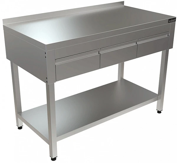 Стол разделочный КОБОР СПБЯ-120/60 П с бортом и выдвижными ящиками применяется в различных производственных цехах предприятий общественного питания, супермаркетах, комбинатах пищевой промышленности для разделывания и обработки пищевых продуктов, а также в качестве вспомогательной поверхности для кухонного оборудования.