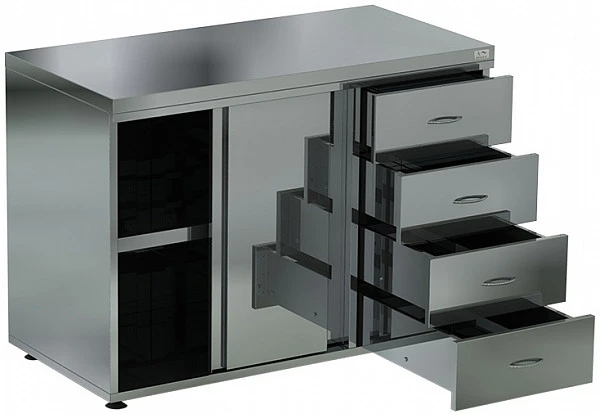Стол-тумба полностью изготовлена из нержавеющей стали aisi 430, что позволяет их применять в различных цехах.