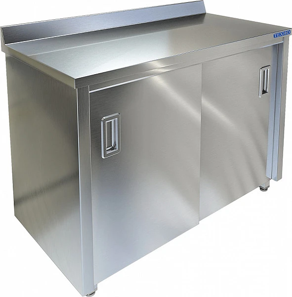 Модель оснащена 2 дверями-купе и регулируемыми по высоте ножками, что позволяет компенсировать неровности пола. Сварной корпус и задняя стенка выполнены из нержавеющей стали AISI 430, столешница - из нержавеющей стали AISI 430 и ЛДСП, полка - из нержавеющей стали.