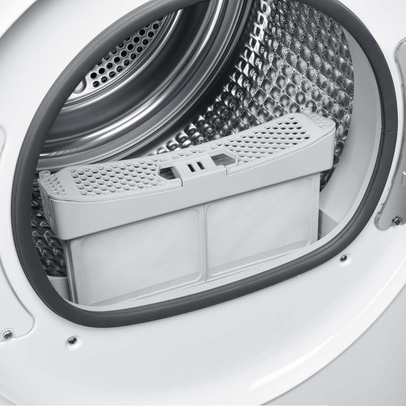 Собирает мелкие частицы пыли, ворс, пух и пыльцу растений. Фильтр удобно чистить — для этого достаньте его из передней части барабана и промойте проточной водой.