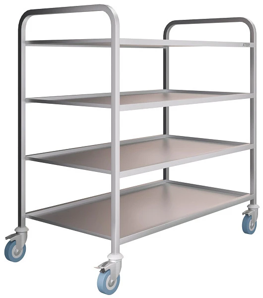 Тележка сервировочная Atesy ТС-Л-4-1100.600.1100-02 предназначена для перемещения в зал приема пищи готовых блюд, напитков и посуды, а также для подачи грязной посуды из зала в моечное отделение на предприятиях общественного питания и торговли.