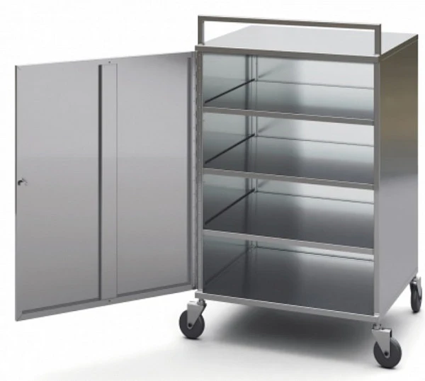 В фронтальной части тележки распашная дверь из нержавеющей стали