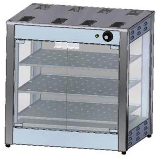 Тепловая витрина выполнена в виде шкафа со стеклянными стенками и с двумя стеклянными дверками спереди.