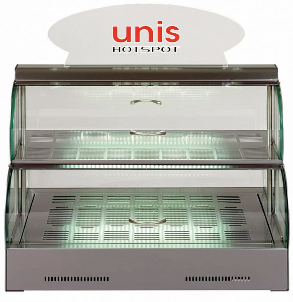 Тепловая витрина UNIS HOT Spot предназначена для демонстрации и подогрева пиццы, круассанов, булочек, выпечки с горячей начинкой, пирогов и различных закусок на предприятиях общественного питания и торговли.