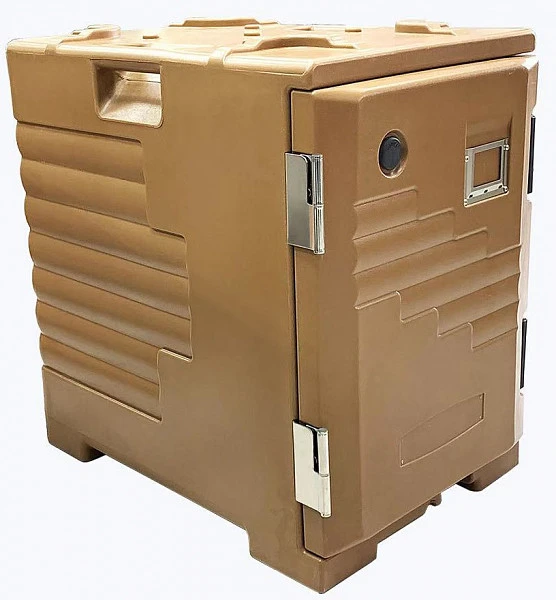 Термоконтейнер с фронтальной загрузкой объемом 90 л из цельнолитой двухслойной конструкции из пищевого полиэтилена толщиной 3 мм с инжекцией пенополиуретана высокой плотности.