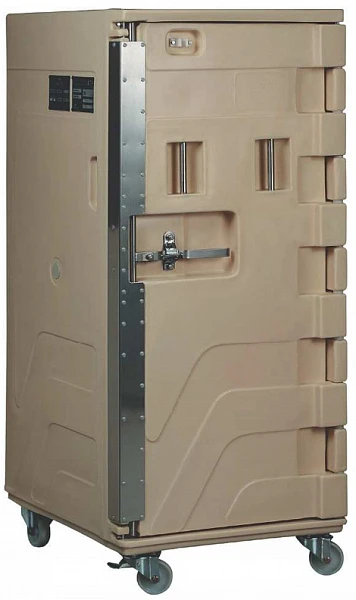 Термоконтейнер с фронтальной загрузкой с объемом 500 л с цельнолитой двухслойной конструкцией из пищевого полиэтилена толщиной 3 мм и с инжекцией пенополиуретана высокой плотности.
