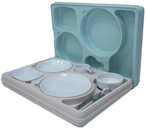 Термоподнос состоит из двух частей: верхняя часть (крышка) полностью закрывает нижнюю. Это позволяет гарантировать безопасность содержимого без риска заражения и загрязнения. Термоподнос можно наполнить посудой из фарфора или пластика (посуда приобретается дополнительно). В закрытом состоянии он поддерживает температуру еды в течение часа.