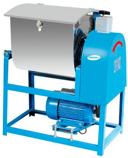 Корпус изготовлен из окрашенной стали, а опрокидываемая дежа и крышка (для предотвращения распыла муки) — из нержавеющей стали.