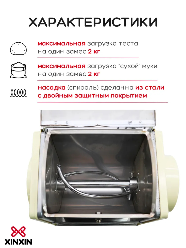Тестомес для крутого теста Xinxin HSE5 используется для замешивания теста для пельменей, чебуреков, вареников, теста для кондитерских и хлебобулочных изделий, для дрожжевого теста.