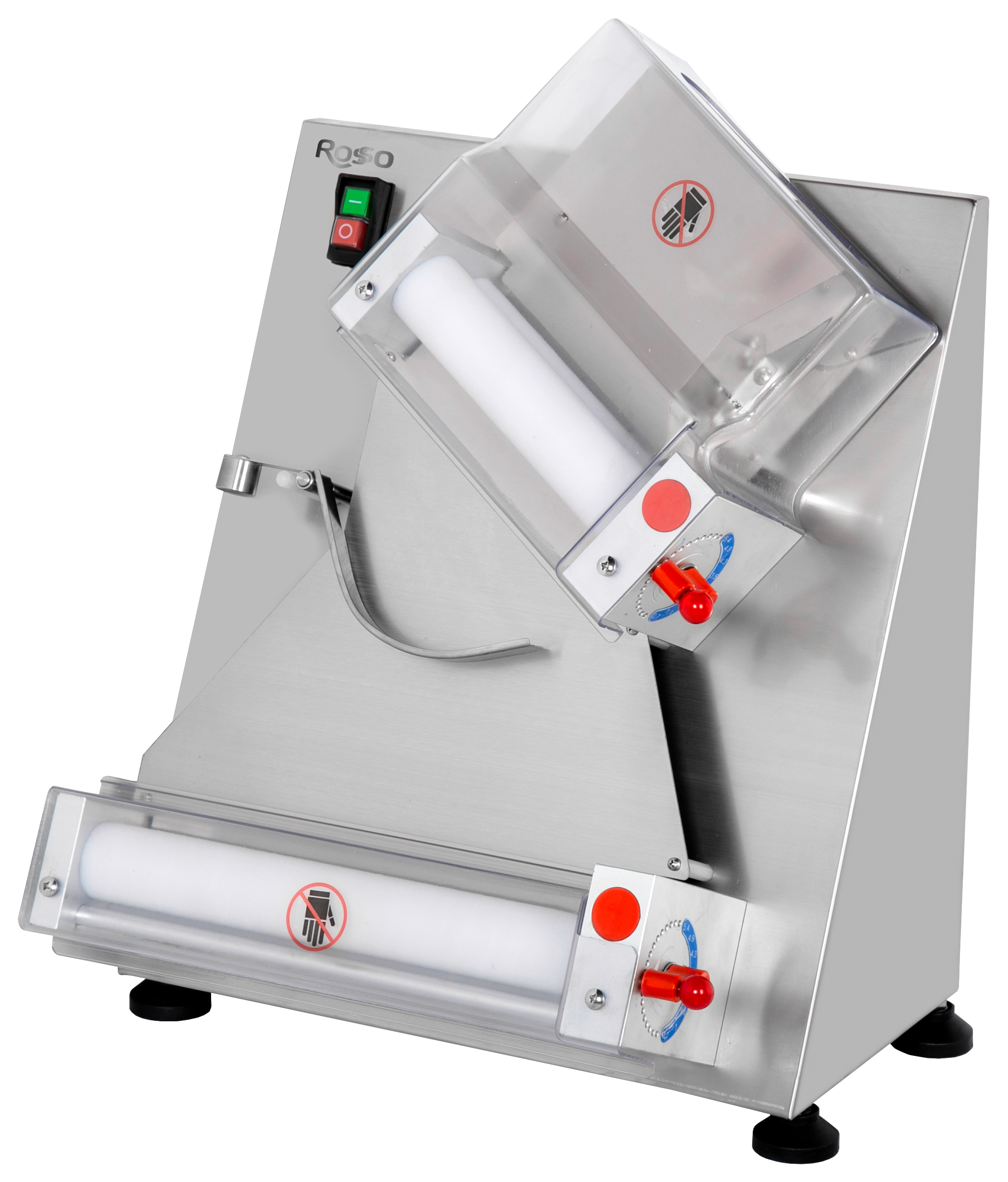 Тестораскаточная машина для пиццы Rosso DR-40 используется для раскатки теста и формирования тестовых заготовок, используемых для последующего приготовления пиццы, лепёшек и других хлебобулочных изделий. Имеет 2 валка, расположенных под углом. Корпус изготовлен из нержавеющей стали, валки – из пищевого полимера.