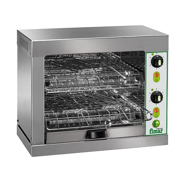 Тостер профессиональный Fimar Top/6 электрический, настольный, двухуровневый. Предназначен для разогрева пиццы, бутербродов, пищевых полуфабрикатов, гамбургеров, сосисок, сандвичей, лепешек и т.п. Вместимость 2х3 изделия. В комплекте 2 полки-решетки, 6 зажимов. Корпус изготовлен из нержавеющей стали.