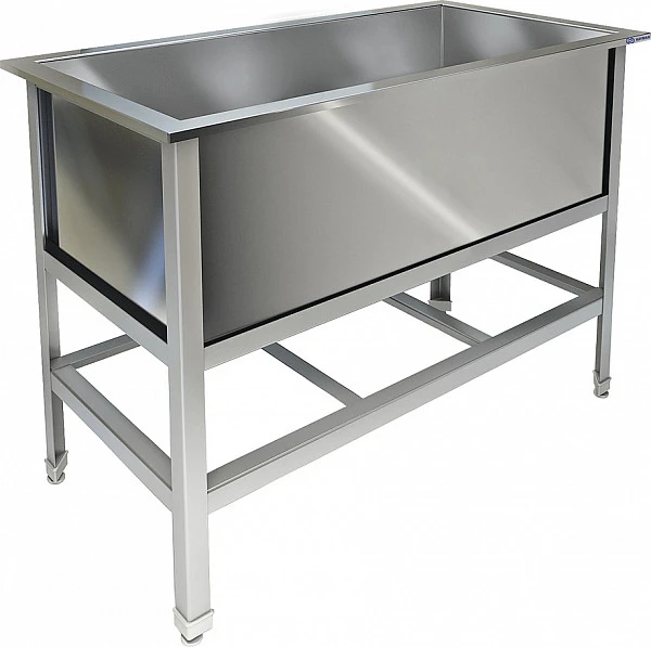 Сварной каркас выполнен из уголка из нержавеющей стали AISI 430 толщиной 2 мм, сварная мойка - из нержавеющей стали AISI 304 толщиной 0,8 мм, выпуск - из нержавеющей стали.