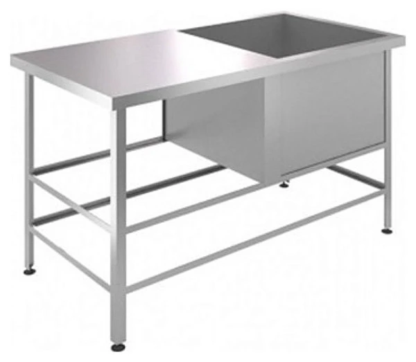 Со съёмным бортом, 1 сварной мойкой справа и рабочей поверхностью слева из нержавеющей стали AISI 430 толщиной 1мм оснащена разборным каркасом из уголка 40х40мм и нижней обвязкой с 4-х сторон из оцинкованной стали толщиной 1,5мм, регулируемыми по высоте пластиковыми опорами ножек.
