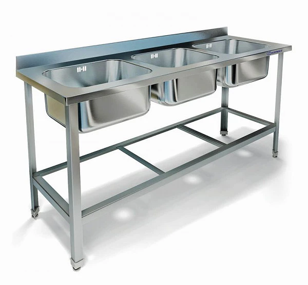 Ванна моечная трехсекционная на каркасе из уголка нержавеющей стали AISI430, емкость цельнотянутая.
