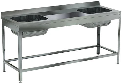 Ванна моечная цельнотянутая двухсекционная с рабочей поверхностью с бортом Кобор ВМЦР/2-180/60 Л/Ц/П предназначена для использования на предприятиях общественного питания для мытья кухонного инвентаря и оттайки замороженных пищевых продуктов.