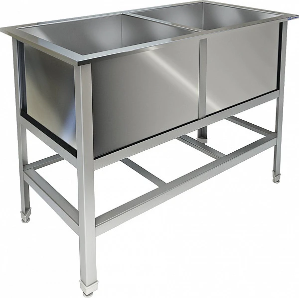 Ванна состоит из двух сварных ёмкостей мойки и каркаса. Мойка ванны сварная, выполнена из пищевой нержавеющей стали и имеет отгибы, которые исключают травмирование персонала. Каркас сварной из профиля толщиной 2 мм, покрытого порошковой краской серого цвета. Ножки ванны снабжены регуляторами высоты, что позволяет устранить неровности пола.