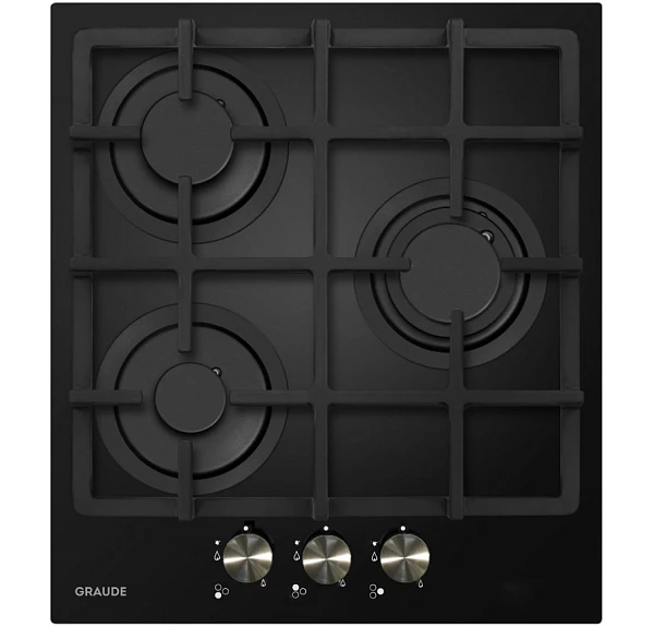 3 конфорки различной степени мощности. Поверхность изготовлена из закаленного стекла, устойчивого к высоким температурам и воздействию агрессивных сред.