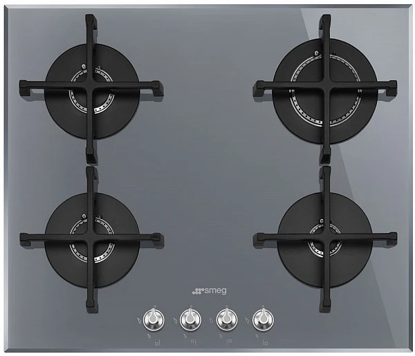 Варочная панель газовая Smeg PV164S2 докажет вам, что техника может и должна быть не только функциональной, но и эстетичной. Дизайн этой модели просто не может не обращать на себя внимания: серебристое глянцевое стекло со скошенным краем, геометричные чугунные решетки (индивидуальные для каждой из 4 конфорок), матовые черные горелки с эмалированными крышками. Даже поворотные переключатели поддерживают стиль, перекликаясь по цвету с газовыми контурами конфорок.