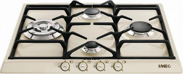 Варочная панель газовая Smeg SR764PO газовая варочная поверхность с эмалированной панелью конфорок кремового цвета. Модель дополнена чугунными решетками для надежного удержания посуды. Автоматический электроподжиг обеспечивает удобство при активации горелок. Система защиты от утечек гарантирует безопасность при эксплуатации устройства. Принцип работы основывается на блокировке подачи газа при обнаружении отсутствия пламени у работающей конфорки. Система срабатывает через несколько секунд, тем самым исключается риск возможной утечки. Это особенно важно при наличии сквозняков.